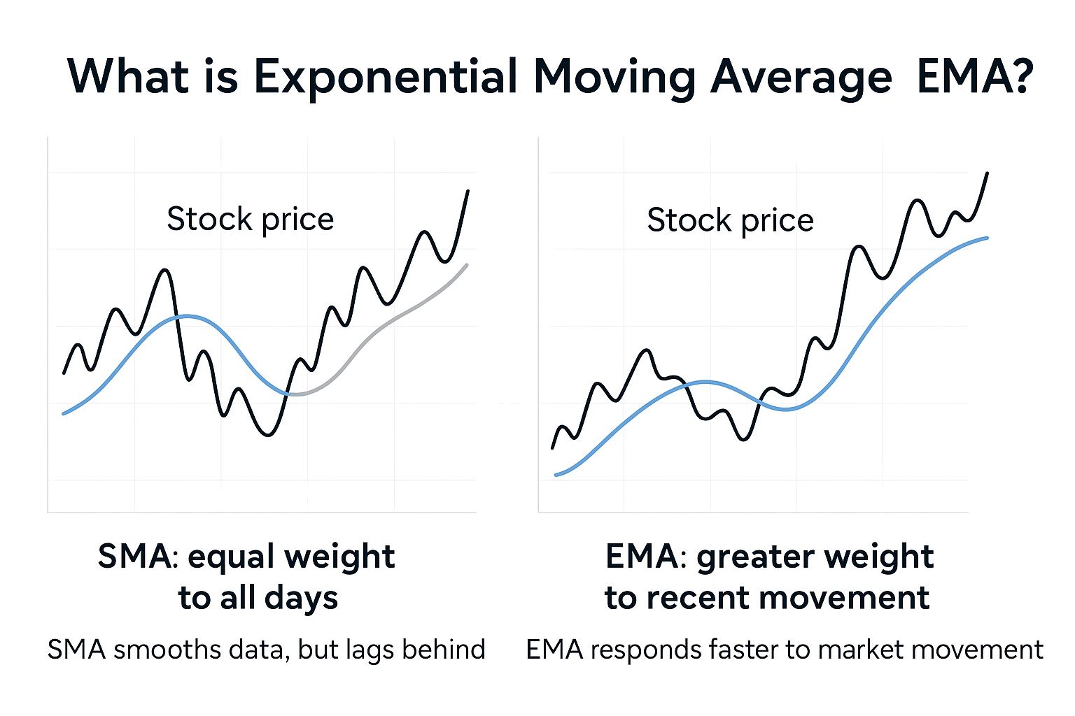EMA отдава по-голяма тежест на последните данни. Ако днес дадена акция е скочила с 5%, EMA веднага го забелязва. Простата пълзяща средна (SMA) третира всички дни еднакво. Тази разлика е от значение, когато се нуждаете от бързи сигнали.