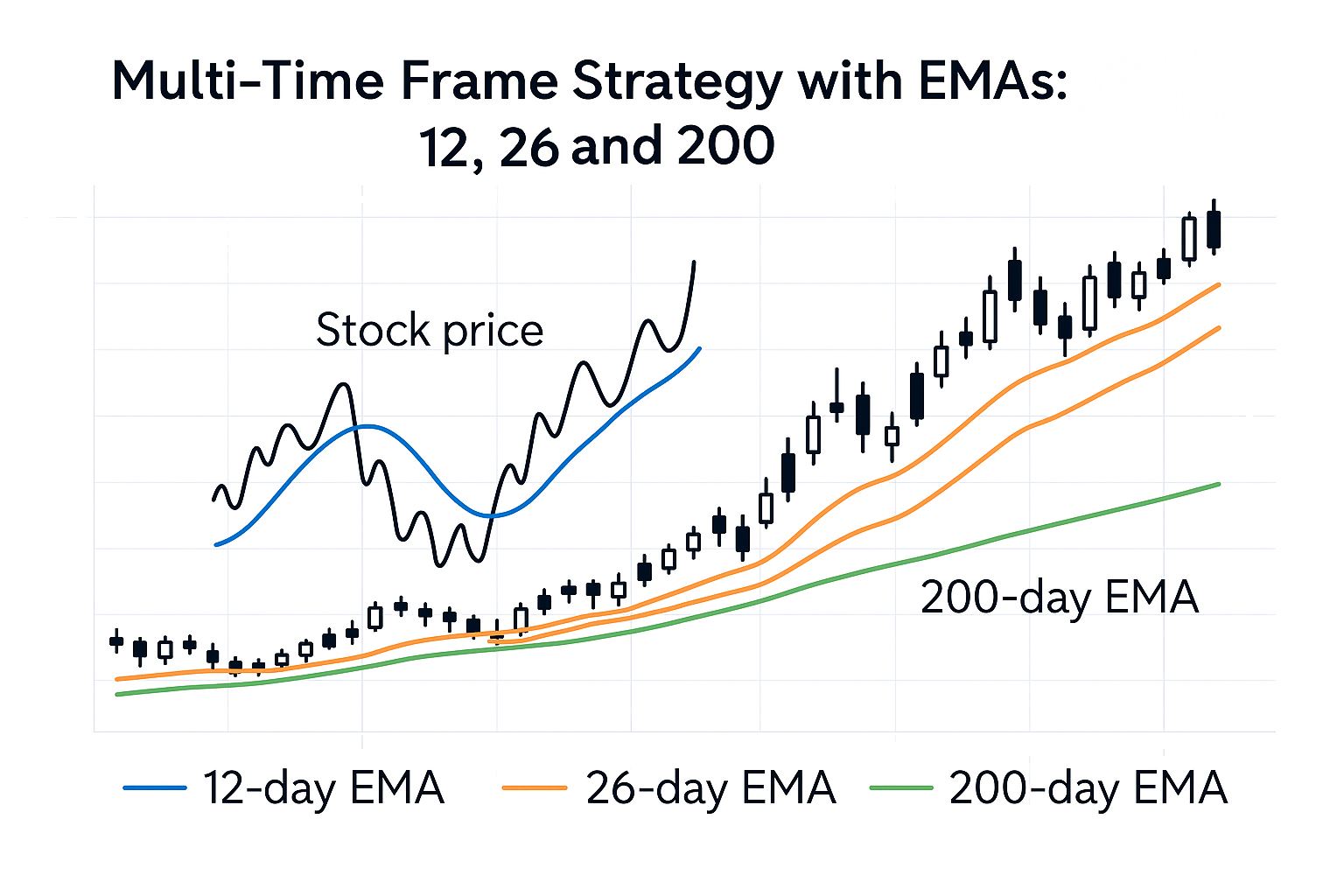 Професионалните трейдъри използват експоненциални пълзящи средни за различни времеви рамки. 12-дневната EMA проследява краткосрочните движения. 26-дневната EMA улавя средносрочните тенденции. 200-дневната EMA показва дългосрочната посока. Всяка от тях служи за конкретна цел в анализа.