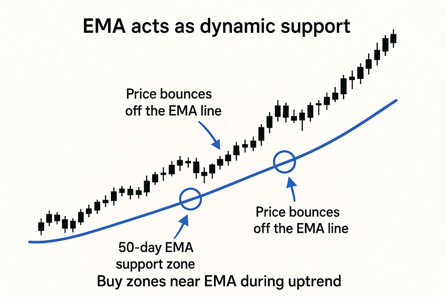 По време на възходящи тенденции, EMA действат като подкрепа. Цените често се отскачат от тях, преди да продължат да се повишават. Трейдърите поставят поръчки за покупка близо до тези нива. 50-дневната EMA осигурява особено силна подкрепа в пазари с тенденция.