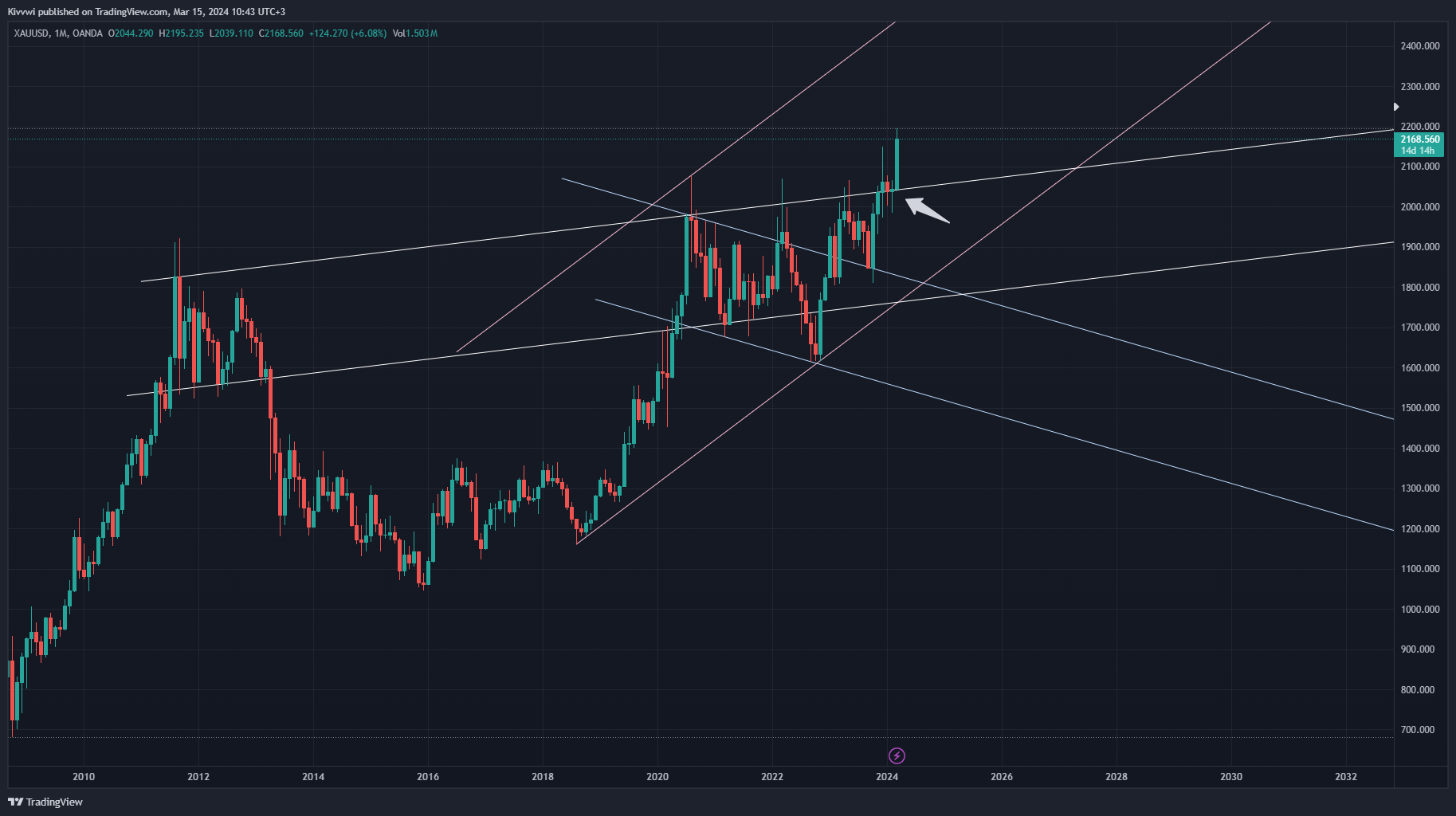 В рамките на розовия тренд се очертава мощна бича тенденция. Ако не слезе под това ниво, златото ще може да надмине 2200 долара. Най-вероятно активът ще следва тенденцията и дори ще достигне нивото от 2400 USD, освен ако не настъпи спад, който да е значително по-силен от синия.