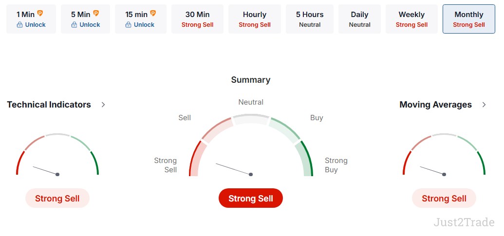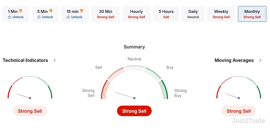 Οι τιμές κινούνται κάτω από όλους τους βασικούς κινητούς μέσους όρους, από τον MA5 έως τον MA200, επιβεβαιώνοντας τη συνεχιζόμενη πτωτική τάση. Η ημερήσια στήριξη εντοπίζεται στην περιοχή 52–56 δολαρίων, ενώ η αντίσταση βρίσκεται κοντά στα 61–65 δολάρια, υποδεικνύοντας πιθανά σημεία προσωρινής ανάκαμψης μέσα στο ευρύτερο πτωτικό περιβάλλον. Συνολικά, το κλίμα της αγοράς παραμένει έντονα αρνητικό, με περιορισμένα περιθώρια ουσιαστικής ανόδου.