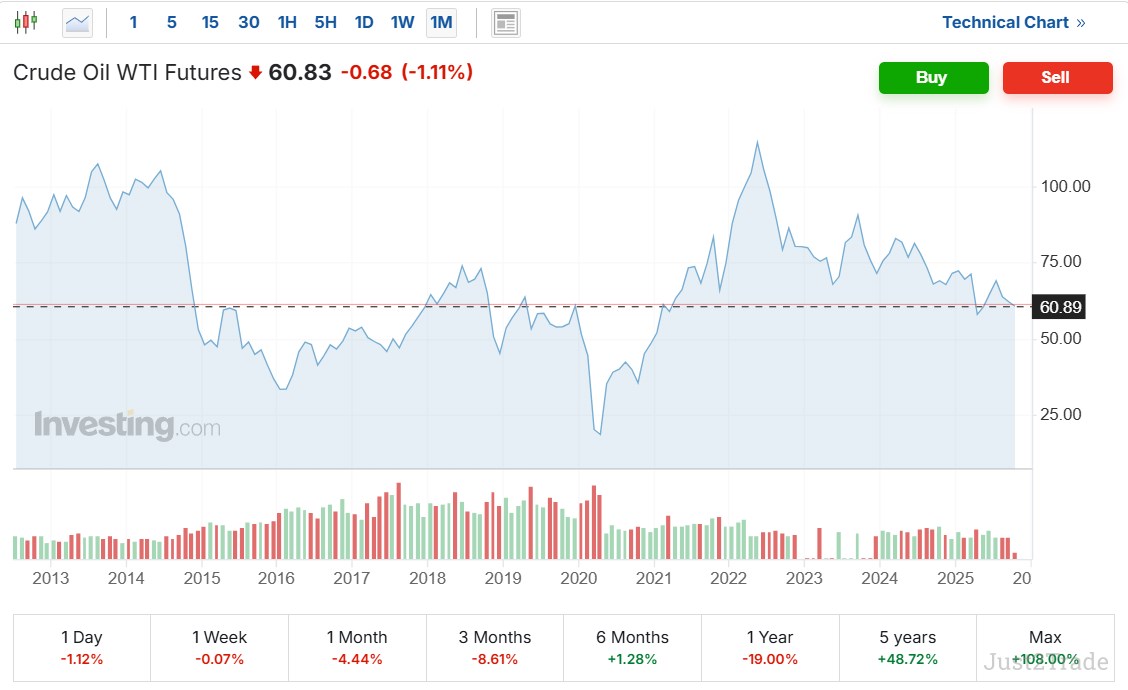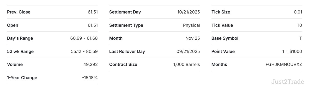 Το συμβόλαιο WTI για τον Νοέμβριο 2025 έχει μέγεθος 1.000 βαρέλια, με αξία tick 10 δολάρια για κάθε μεταβολή 0,01 στην τιμή. Σε μακροπρόθεσμο ορίζοντα, το WTI έχει ενισχυθεί κατά 48,72% την τελευταία πενταετία και κατά 108% από το ιστορικό χαμηλό του.