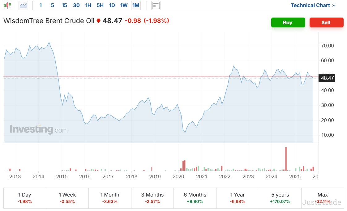Το WisdomTree Brent Crude Oil ETF διαπραγματεύεται σήμερα στα 61,92 δολάρια. Πρόκειται για ένα διαπραγματεύσιμο αμοιβαίο κεφάλαιο (ETF) που παρακολουθεί τον δείκτη Bloomberg Commodity Sub Brent Crude TR USD και προσφέρει άμεση έκθεση στα συμβόλαια μελλοντικής εκπλήρωσης Brent.