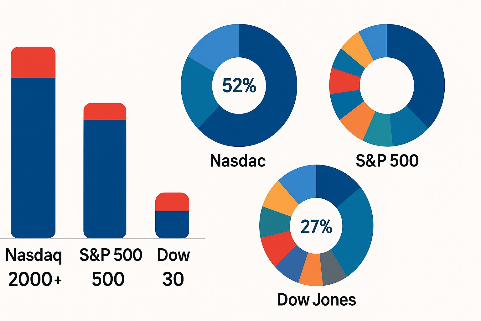 Los índices bursátiles funcionan como «barómetros» de diferentes sectores económicos o de la economía en general. El Nasdaq Composite refleja principalmente el desempeño del sector tecnológico, el Dow Jones muestra el rendimiento de grandes corporaciones, mientras que el S&P 500 representa la salud general de la economía estadounidense.