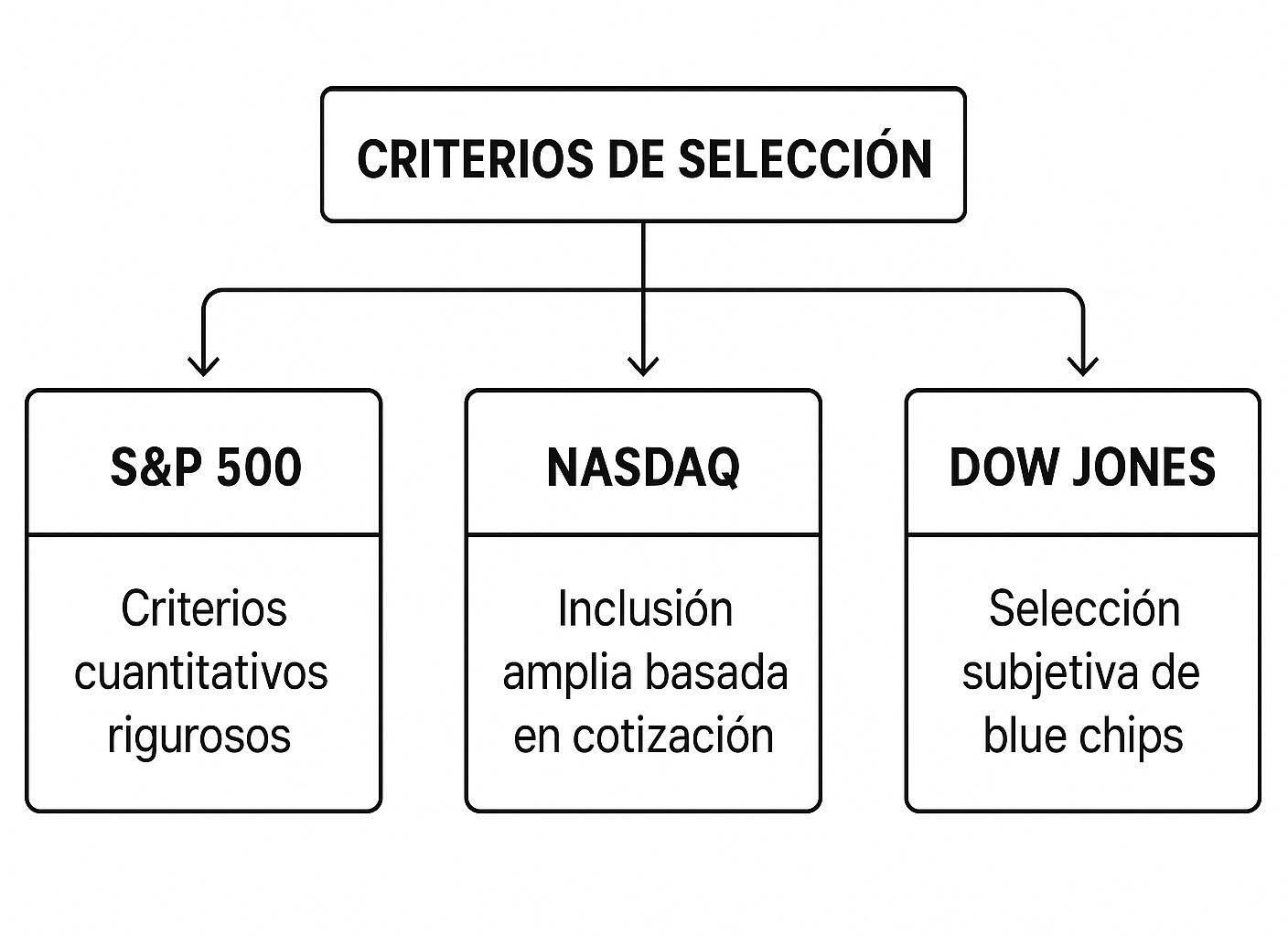 El Dow Jones selecciona empresas del SP 500 con requisitos adicionales como reputación empresarial sólida y representatividad sectorial, aunque no requiere volumen mínimo de trading. La selección es más subjetiva, enfocándose en empresas blue chip con historiales probados de estabilidad y dividendos consistentes.