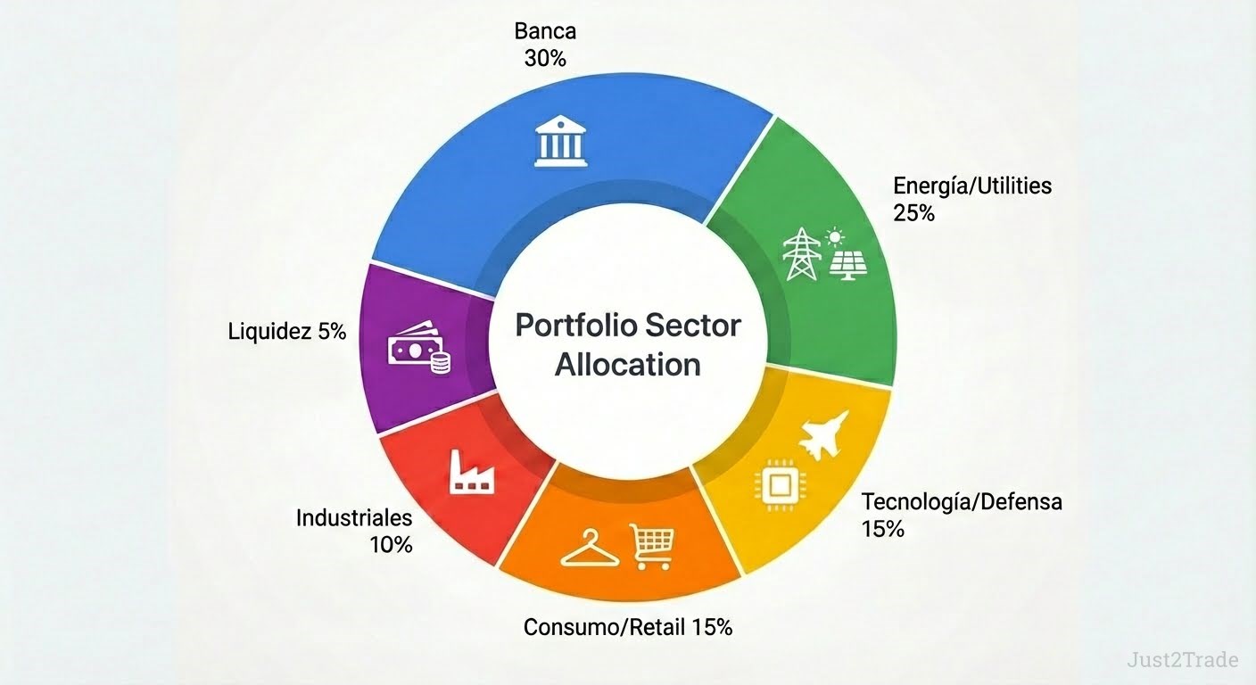- Banca: 30% – Rendimiento vía dividendos, exposición reducida respecto a 2025