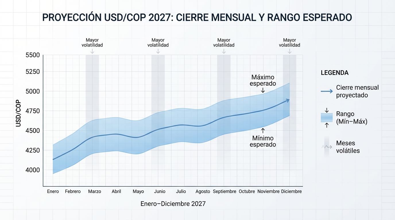 - El dólar estadounidense se proyecta en Colombia dentro de rangos definidos, con un escenario base de 3.500–3.600 COP al cierre de 2026 y fluctuaciones esperadas entre 3.300 y 3.600 COP en 2027.