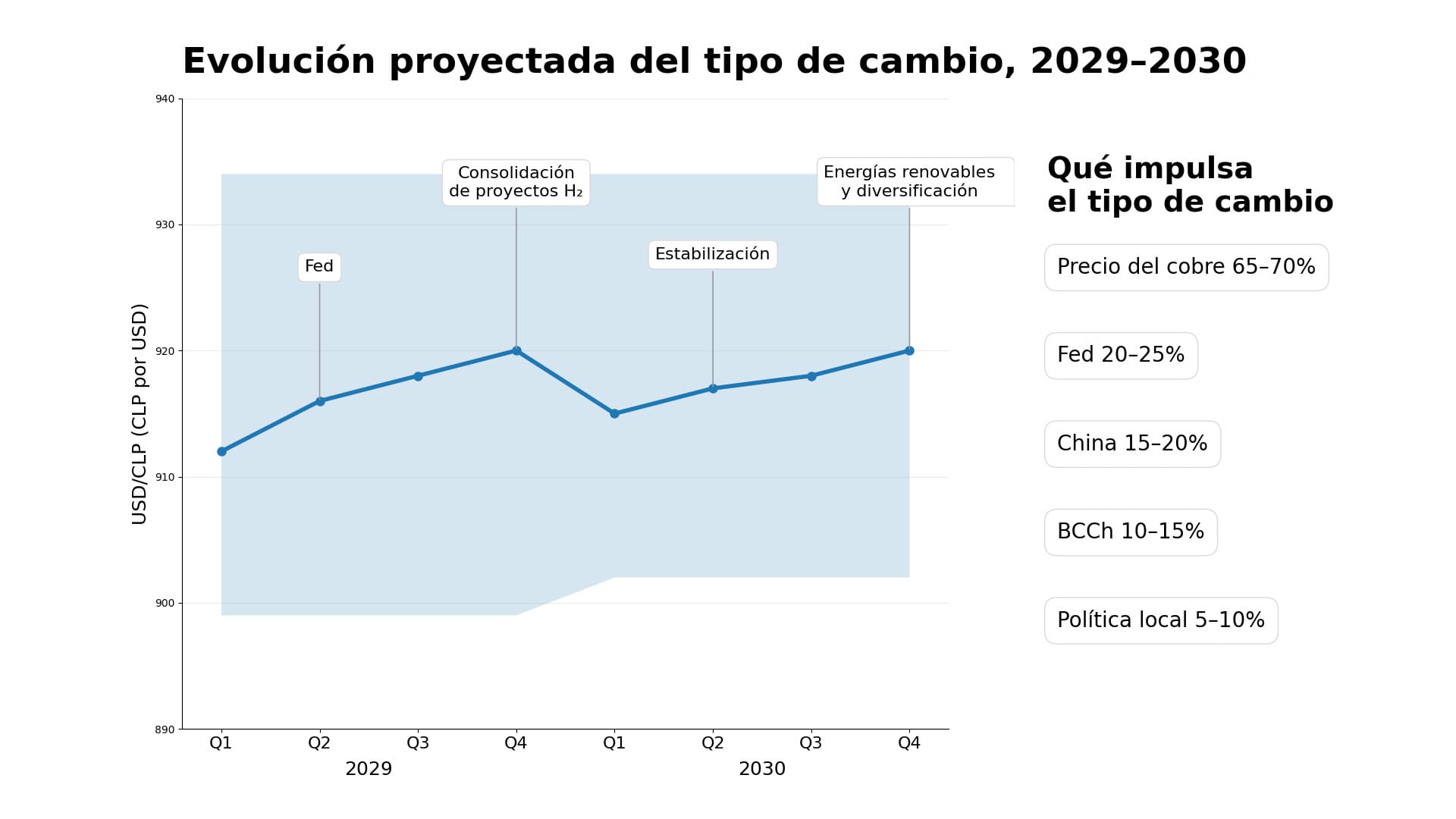 2028: 915-940 CLP mayor estabilidad. 2029-2030: rango estructural 900-950 CLP, punto medio ~920-925 CLP. Asume políticas prudentes, cobre US$4,00-4,50/lb, diversificación con hidrógeno verde. Volatilidad reducida vs históricos.