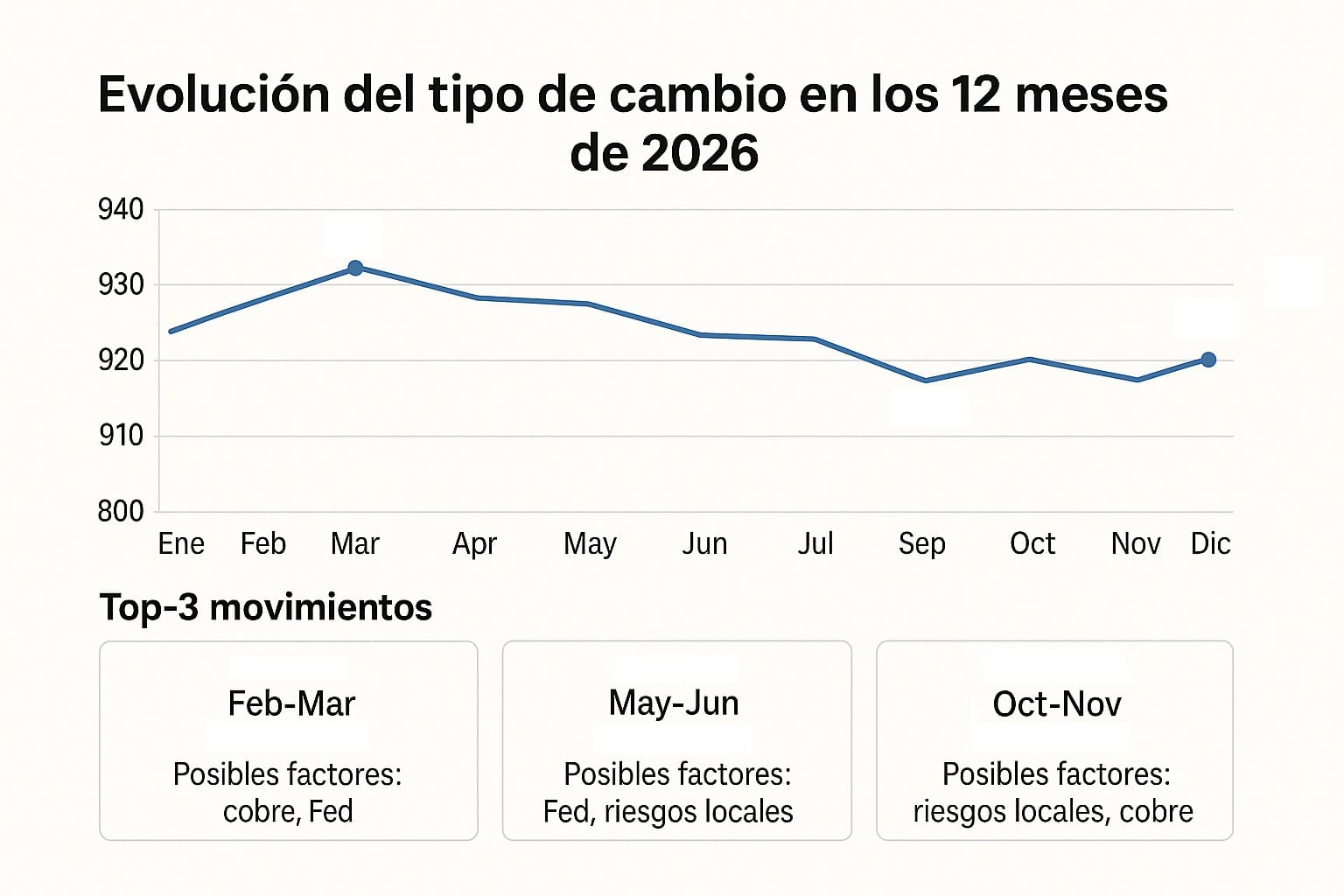 La proyección para 2026 anticipa rango 935-960 pesos chilenos como escenario base, promedio anual ~945 CLP. Considera cobre >US$4,40/lb según Cochilco, política monetaria BCCh y Fed, y normalización política post-electoral.