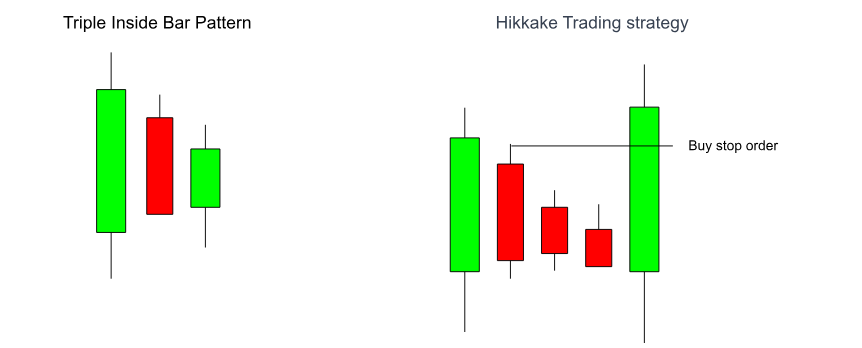 Wzorzec Hikkake to strategia Inside Bar dla handlu fałszywymi wyłomami. Występuje wtedy, gdy cena chwilowo przebija zakres świecy wewnętrznej, a następnie szybko się odwraca. Kluczem tutaj jest: