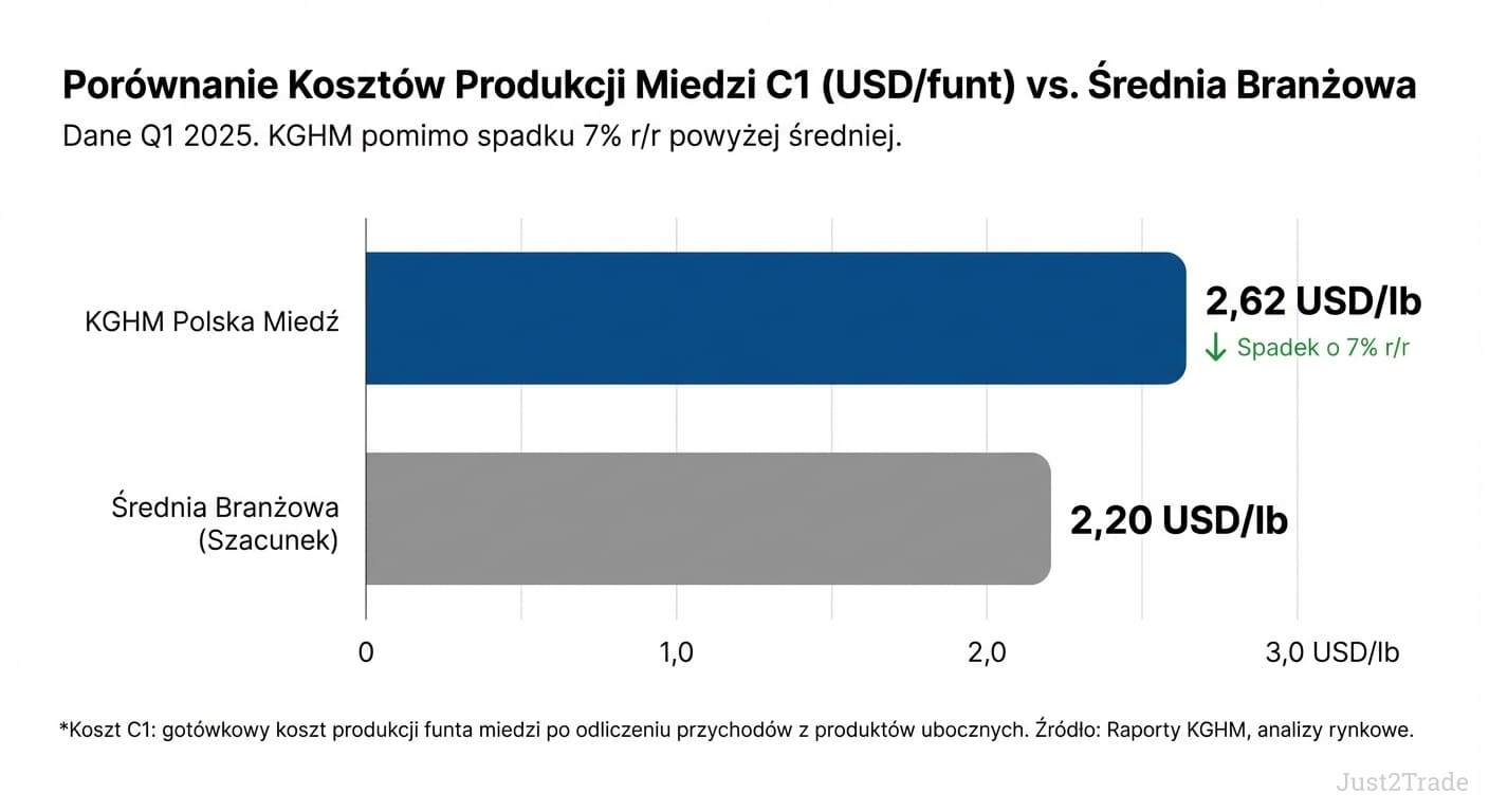 JP Morgan: przychody 43,1 mld PLN (+19,7% r/r), stopa dywidendy 1,1%. Q1 2025 wyniki: przychody 8,9 mld PLN, EBITDA 2,49 mld PLN (+60% r/r), zysk netto 330 mln PLN. Ostatni kwartał: 433 mln PLN (+73,9%). Produkcja 169 tys. ton miedzi. Prognoza miedzi: 11 400 USD/t (Goldman Sachs).
