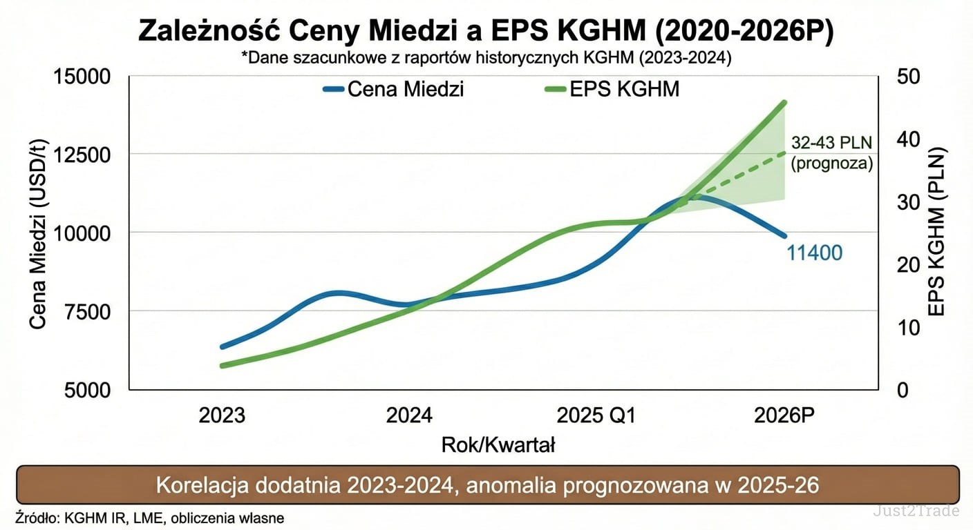 Korelacja bardzo silna: 0,85 – 0,90 dla miedzi, 0,65 – 0,75 dla srebra. Miedź to ~75% przychodów, srebro ~12%. Zmiana ceny miedzi o 10% = 12-15% zmiana zysku operacyjnego. Srebro powyżej 100 USD może dodać 2 – 3 PLN do EPS.