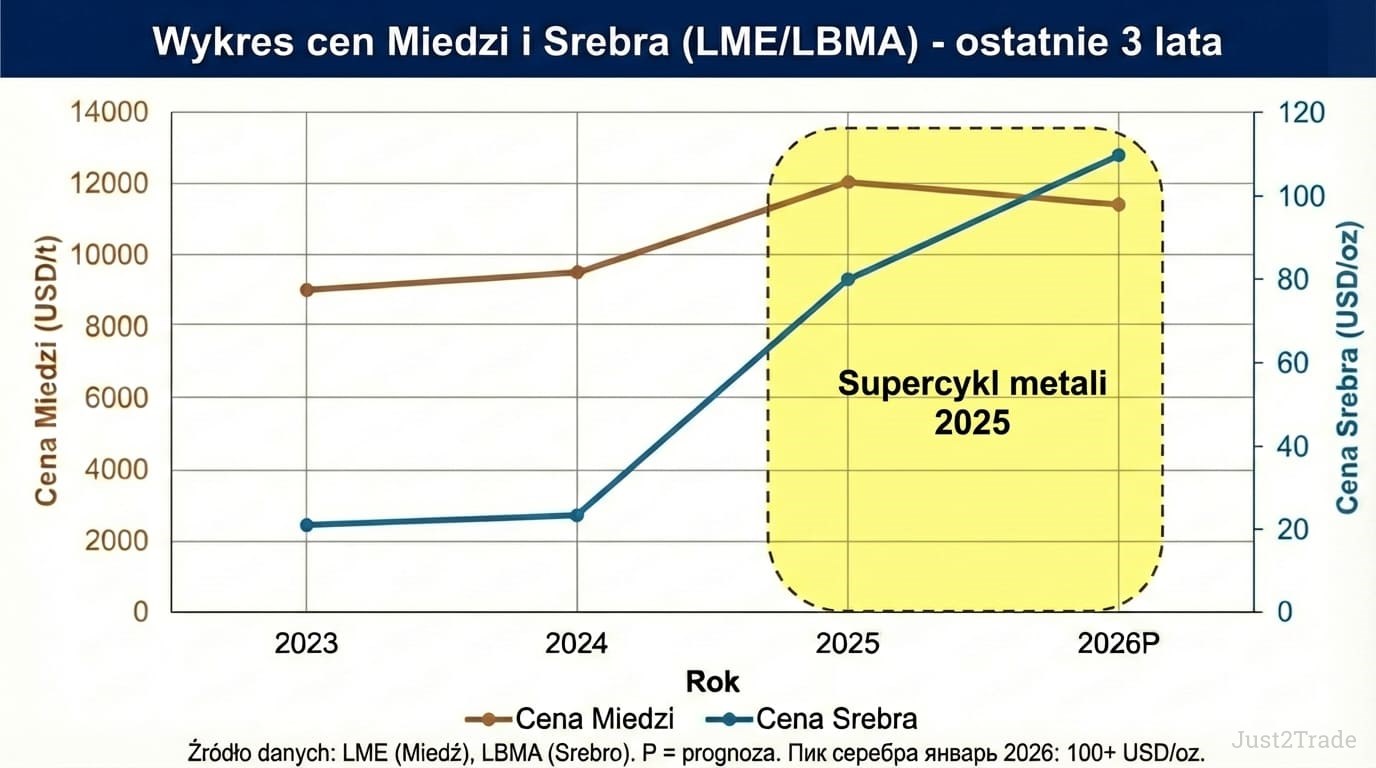 Główne sterowniki: (1) rekordowe ceny miedzi (szczyt 13 000 USD, obecne ~11 700 USD), (2) srebro powyżej 100 USD/uncja, (3) strukturalny deficyt miedzi (450 tys. ton poza USA), (4) optymizm elektromobilność (+35% r/r), (5) silna EBITDA Q1 2025 (+60% r/r), (6) podwyższenie rekomendacji JP Morgan do „przeważaj”.