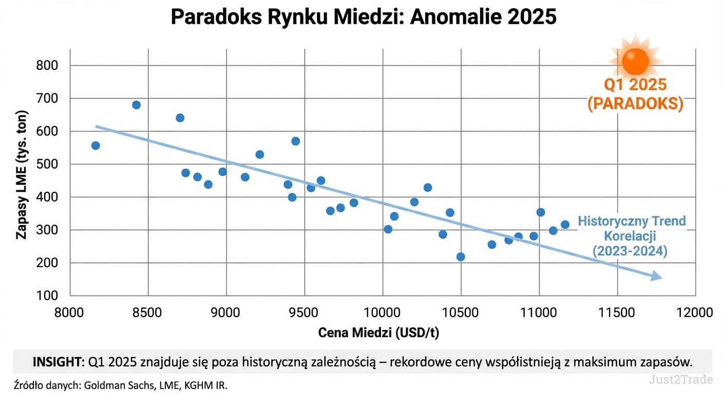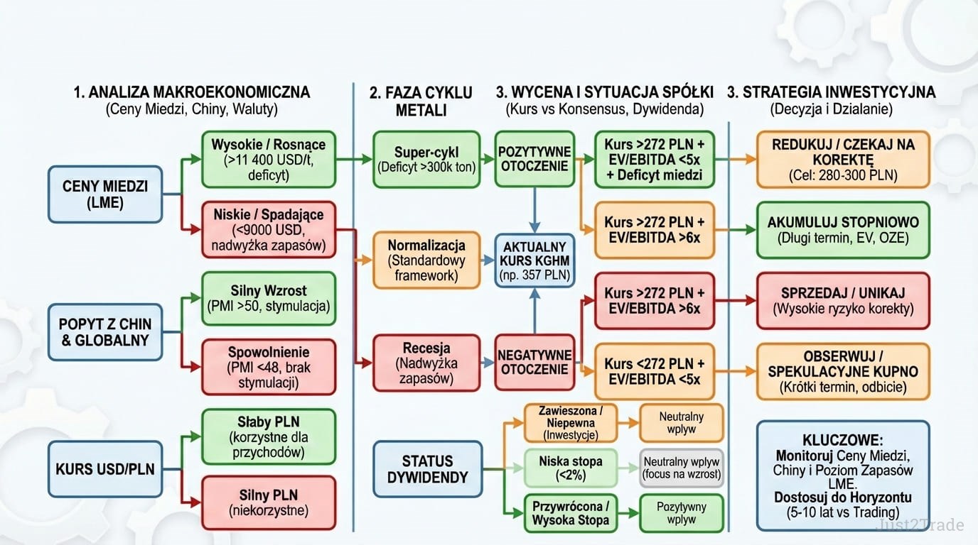 Kluczowe: (1) głębsze spowolnienie Chin (popyt już -8% Q4 2025), (2) wysokie zapasy LME (789 tys. ton - 8-letnie maksimum), (3) wycena powyżej konsensusu (357,2 PLN wobec 272 PLN), (4) brak dywidendy, (5) mocny złoty, (6) brak ulgi podatkowej. Zmienność ±30 – 40% rocznie.
