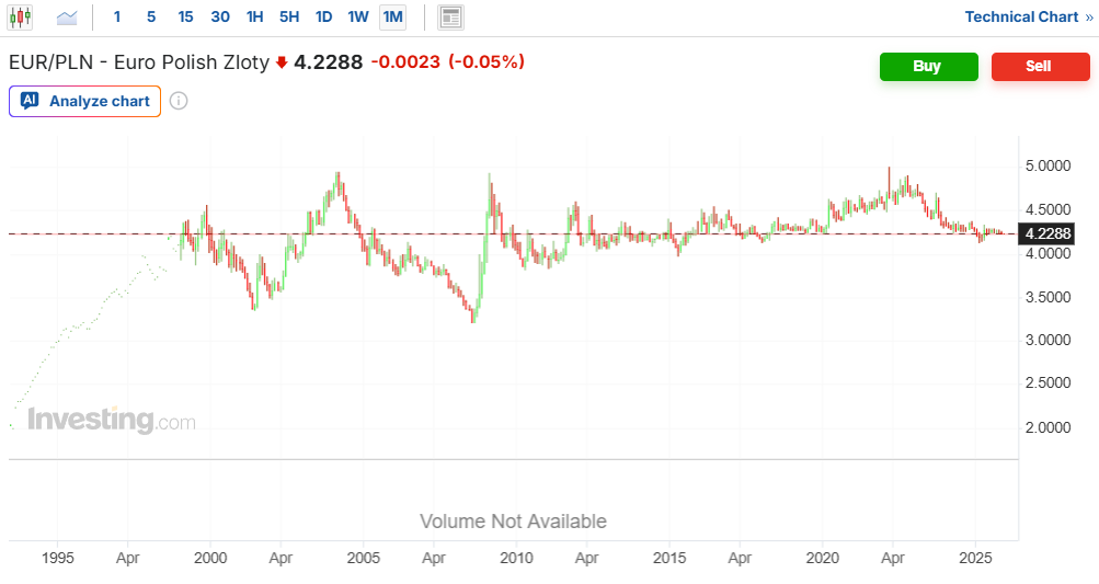 Od września 2025 r. para EUR/PLN utrzymuje się w relatywnie wąskim przedziale, a krótkoterminowe prognozy WalletInvestor i LongForecast na listopad–grudzień 2025 r. wskazują na stabilizację kursu w okolicach 4,20–4,22 zł za euro (zamknięcia rzędu 4,209–4,219). Oznacza to, że do końca 2025 roku rynek pozostaje bez wyraźnego przełomu, a złoty jedynie stopniowo umacnia się wobec wspólnej waluty.