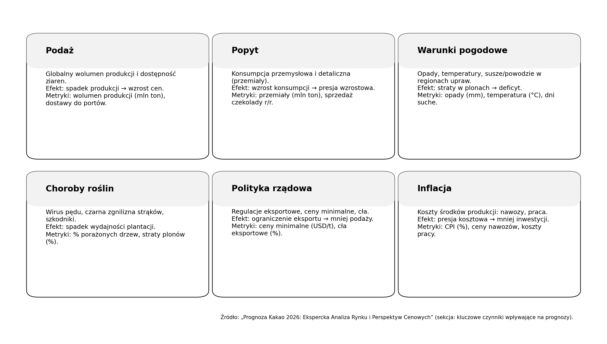 W modelach prognostycznych, opartych na analizie cen kakao, uwzględnia się sześć kluczowych czynników wpływających na ceny kakao, w tym: podaż, popyt, zmianę klimatu i inflację. Doświadczenie rynkowe wskazuje, że najbardziej niedoszacowanym czynnikiem pozostaje długoterminowy wpływ zmiany klimatu na podaż kakao, który przy utrzymującym się popycie wywiera rosnącą presję cenową.