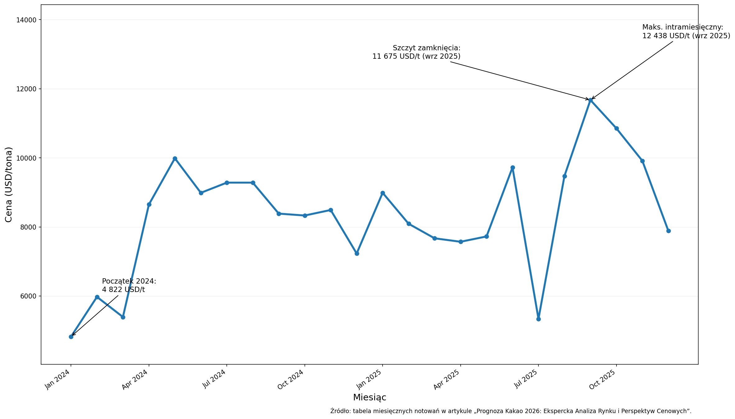 Rok 2024 zapisze się w historii rynku kakao jako okres bezprecedensowej zmienności. We wrześniu 2025 roku ceny osiągnęły historyczne maksimum na poziomie 12 438 USD za tonę. Kontrakty futures na nowojorskiej giełdzie ICE wzrosły o 79% między styczniem 2024 (4 822 USD/t) a majem 2024 (9 988 USD/t), z przejściowymi szczytami przekraczającymi 10 000 USD w maju 2024 (maks. 10 075 USD/t) oraz grudniu 2024 (maks. 10 508 USD/t).