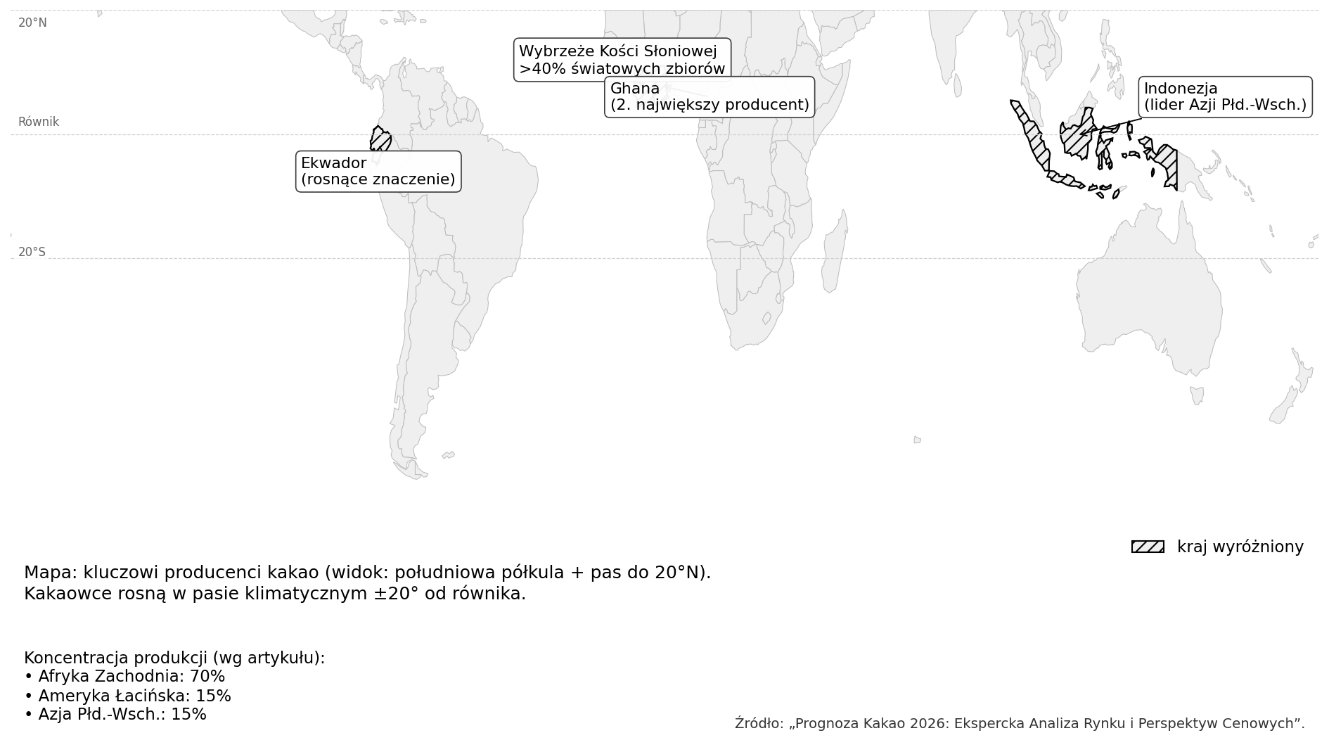 Kluczową rolę w kształtowaniu rynku kakao odgrywa Afryka Zachodnia, odpowiadająca za ponad 70% globalnej produkcji. Wybrzeże Kości Słoniowej, jako największy producent, nadal zmaga się z ograniczeniami strukturalnymi, które bezpośrednio wpływają na podaż kakao. Jednocześnie stabilny popyt na kakao na rynkach międzynarodowych ogranicza potencjał dalszego spadku cen.