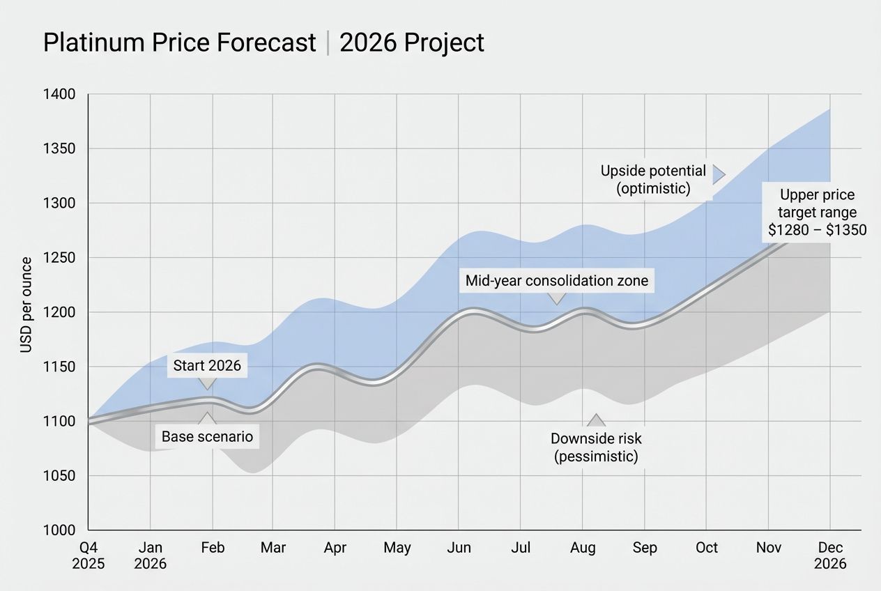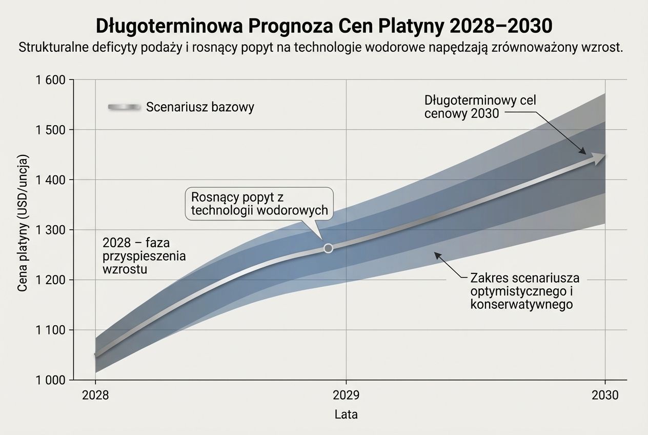 Według konsensusu analityków, cena platyny w 2026 roku może osiągnąć 2 100 - 2 500 USD za uncję, co oznacza wzrost o 15-35% względem poziomu z końca 2025. Na 2027 rok prognozy wskazują na przedział 2 500 - 2 800 USD. Główne czynniki wspierające to deficyt podaży, rozwój technologii wodorowych oraz rosnący popyt jubilerski z Chin.