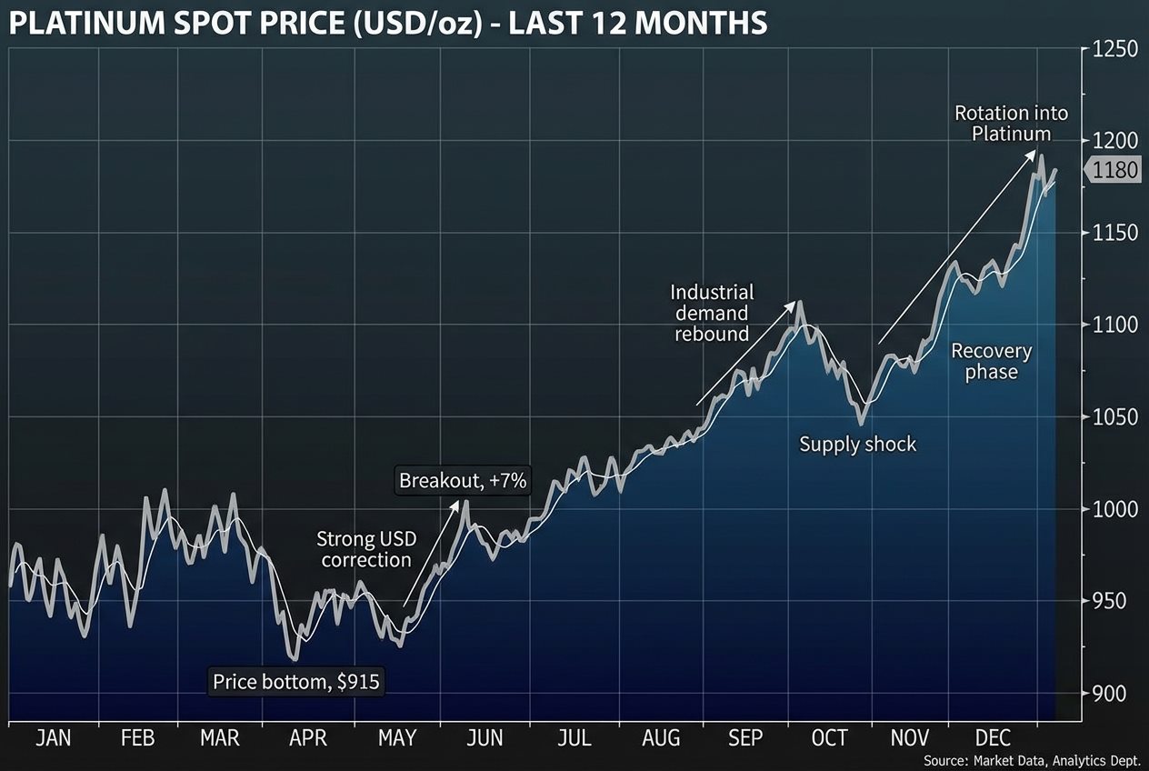 Rynek platyny wchodzi w 2026 rok w fundamentalnie odmienionej sytuacji niż jeszcze dwa lata wcześniej. W grudniu 2025 roku cena platyny oscyluje w granicach 1 830 - 1 925 USD za uncję, co oznacza wzrost o około 90% od styczniowych minimów na poziomie 878 USD. Ta spektakularna dynamika cenowa wynika przede wszystkim z rotacji kapitału inwestycyjnego – inwestorzy poszukują niedowartościowanych metali szlachetnych po tym, jak złoto osiągnęło rekordowe poziomy przekraczające 4 300 USD za uncję.