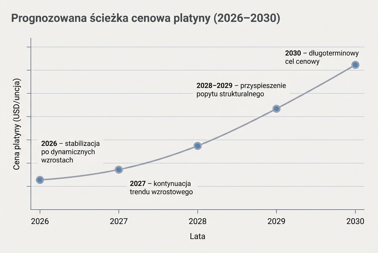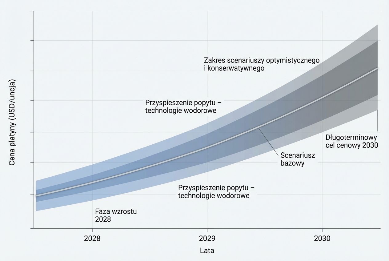 Według konsensusu analityków, cena platyny w 2026 roku może osiągnąć 2 100 - 2 500 USD za uncję, co oznacza wzrost o 15-35% względem poziomu z końca 2025. Na 2027 rok prognozy wskazują na przedział 2 500 - 2 800 USD. Główne czynniki wspierające to deficyt podaży, rozwój technologii wodorowych oraz rosnący popyt jubilerski z Chin.