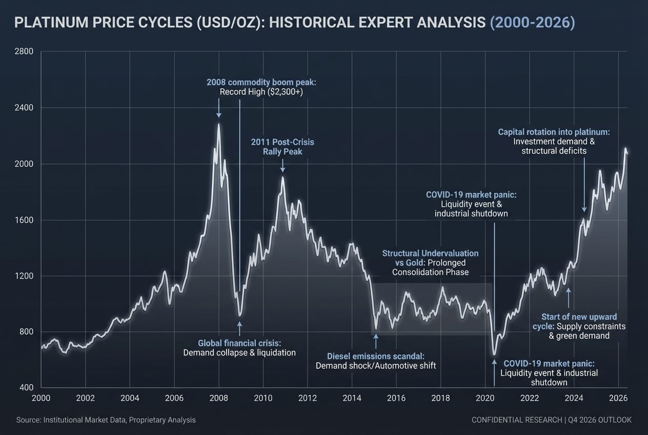 Rynek platyny wchodzi w 2026 rok w fundamentalnie odmienionej sytuacji niż jeszcze dwa lata wcześniej. W grudniu 2025 roku cena platyny oscyluje w granicach 1 830 - 1 925 USD za uncję, co oznacza wzrost o około 90% od styczniowych minimów na poziomie 878 USD. Ta spektakularna dynamika cenowa wynika przede wszystkim z rotacji kapitału inwestycyjnego – inwestorzy poszukują niedowartościowanych metali szlachetnych po tym, jak złoto osiągnęło rekordowe poziomy przekraczające 4 300 USD za uncję.
