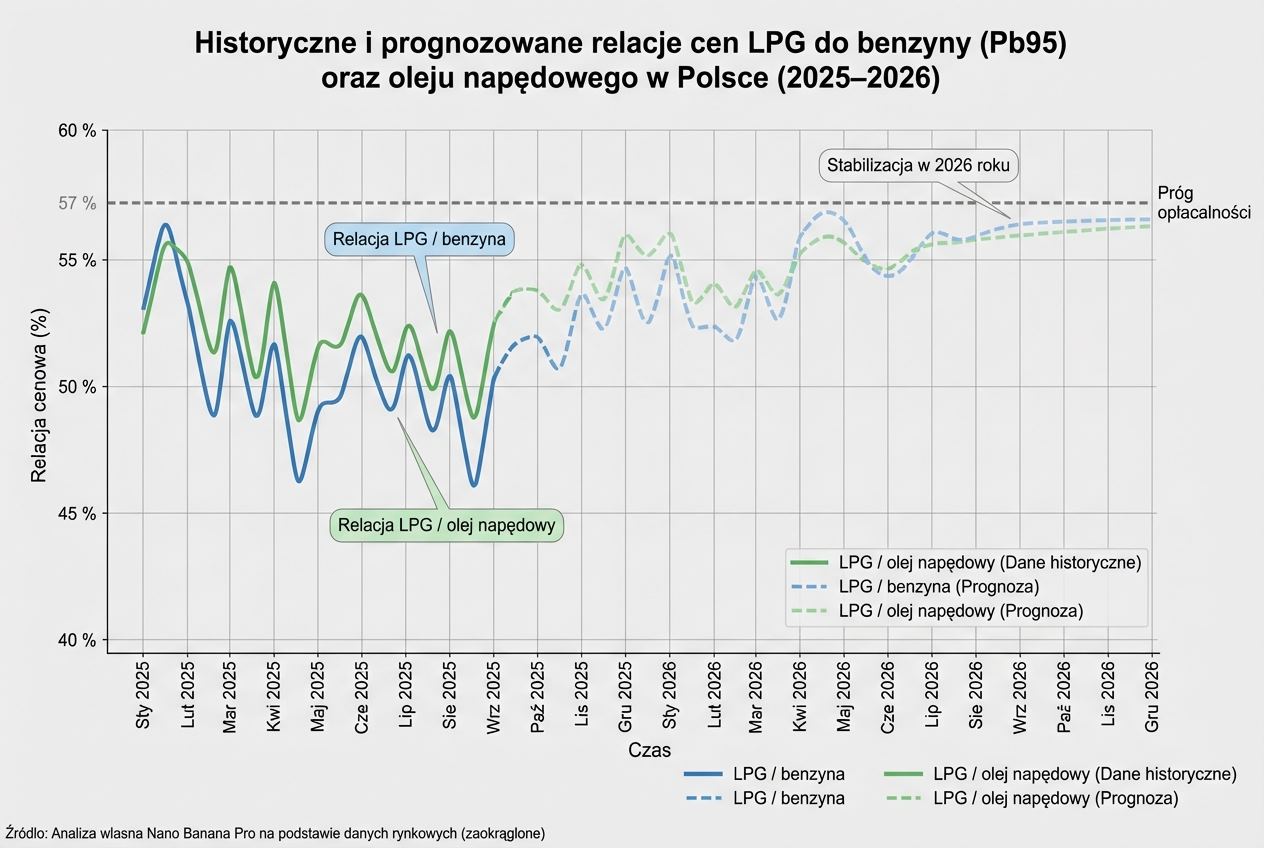 Relacja cenowa LPG do benzyny w 2026 roku utrzyma się w przedziale 52-57%, zbliżając się do historycznego progu opłacalności (57%), jednak wciąż zapewniając ekonomiczne korzyści dla kierowców. Nawet przy relacji 57% użytkownicy z umiarkowanym i dużym przebiegiem osiągną wymierne oszczędności.
