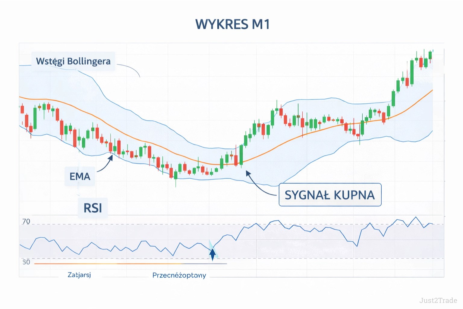 - działanie wskaźników (RSI, EMA, Bollinger Bands),