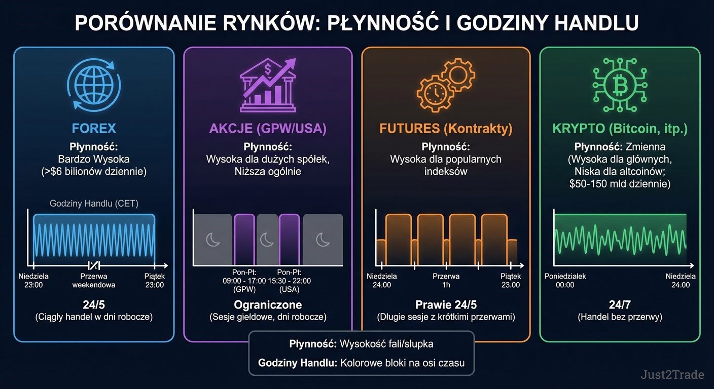 - Kryptowaluty - handel 24/7, lecz zmienne spready i mniejsza stabilność warunków realizacji.
