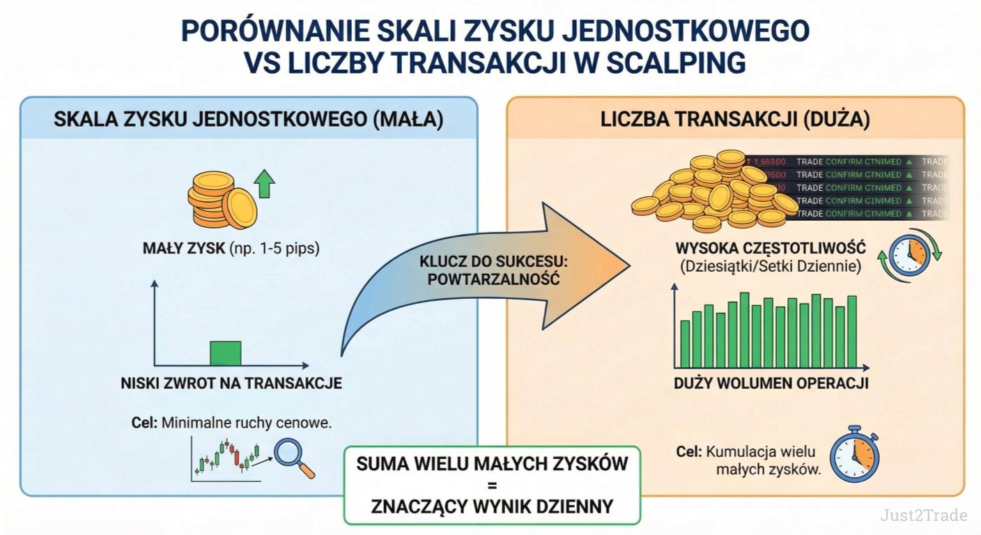 Zyski scalping zależą od trzech elementów: skuteczności wejść, relacji zysku do ryzyka oraz kosztów (spread, prowizja, poślizg). Prosty przykład pokazuje, jak działa skala: