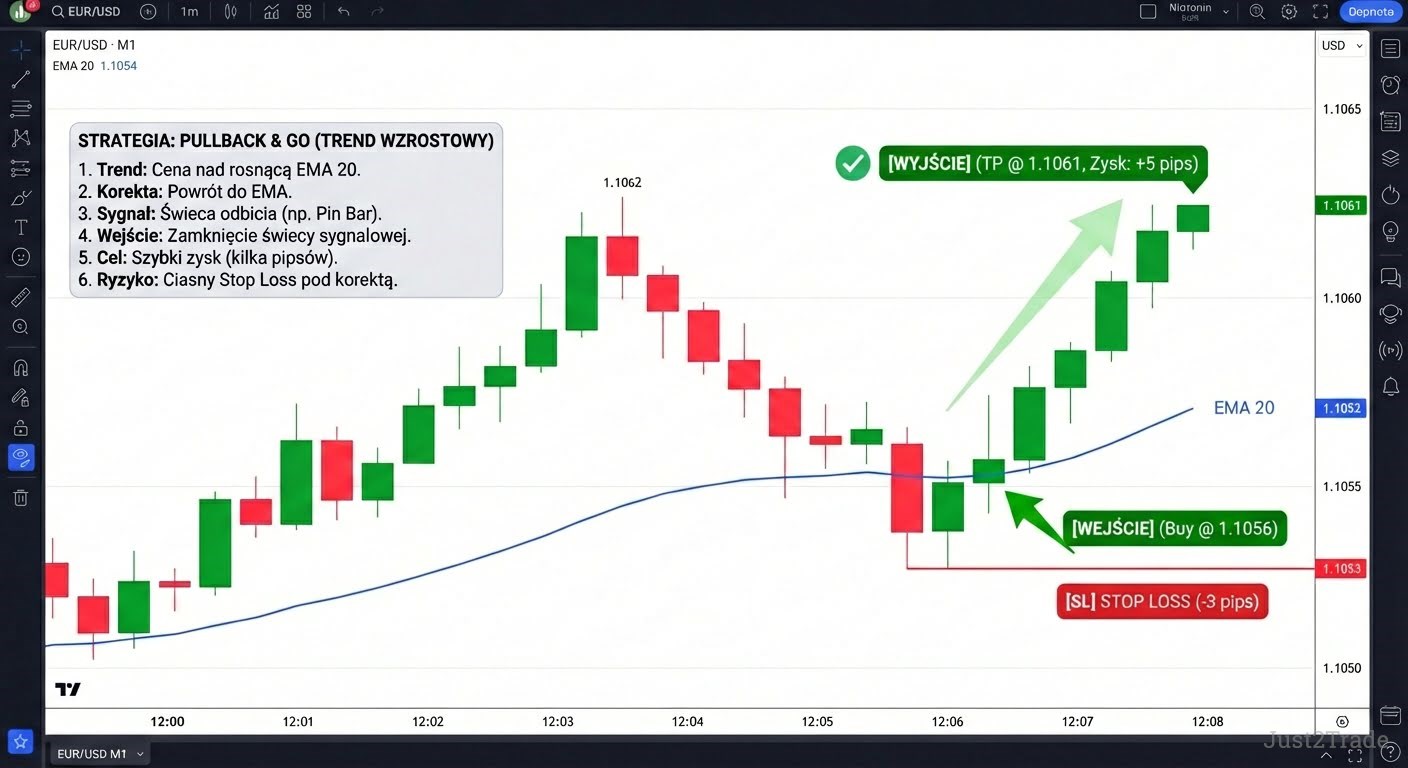 W scalping EMA pomaga ograniczyć liczbę transakcji zawieranych przeciwko dominującemu kierunkowi rynku, zwiększając selektywność wejść i stabilność wyników.