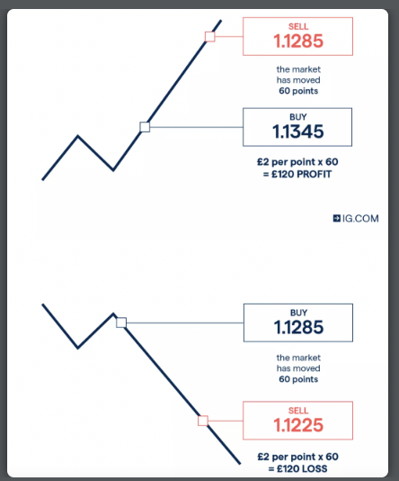 Na przykład, jeśli uważasz, że cena rynkowa wzrośnie, kupiłbyś po bieżącej cenie, a następnie zamknął swoją pozycję po wyższej cenie, aby osiągnąć zysk. Zyski lub straty są określane przez ruchy rynkowe w stosunku do początkowego zakładu spread.