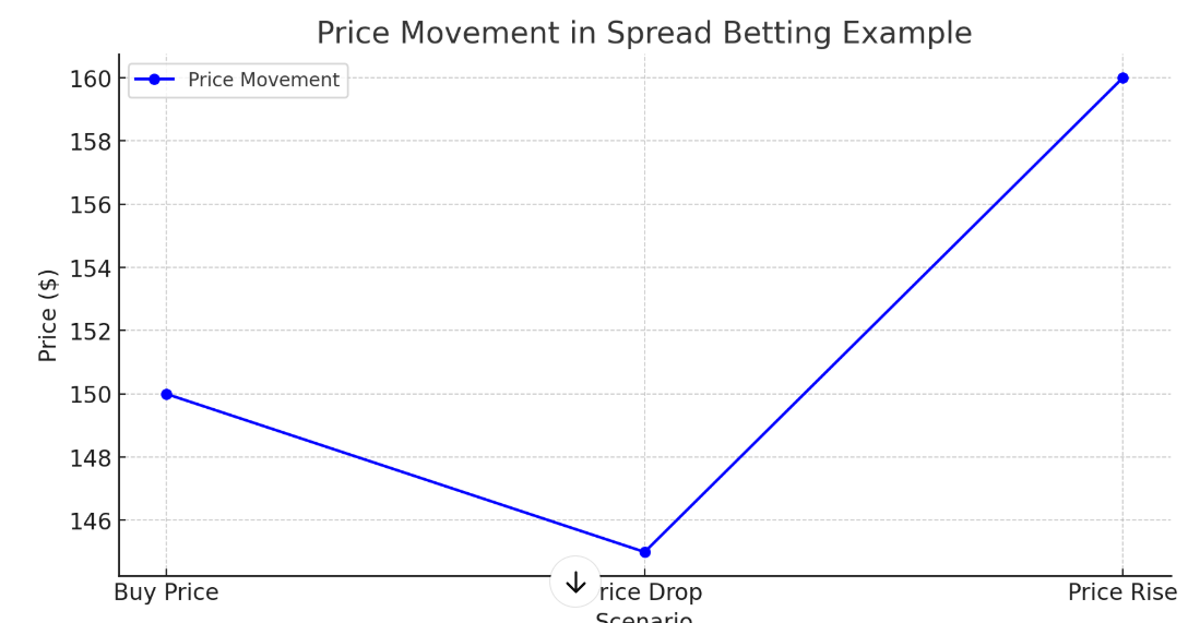 Rozważmy zakład typu spread na akcje Apple. Załóżmy, że zajmujesz długą pozycję, oczekując wzrostu ceny. Cena kupna wynosi 150 USD, a cena sprzedaży 148 USD, ze spreadem w wysokości 2 USD.