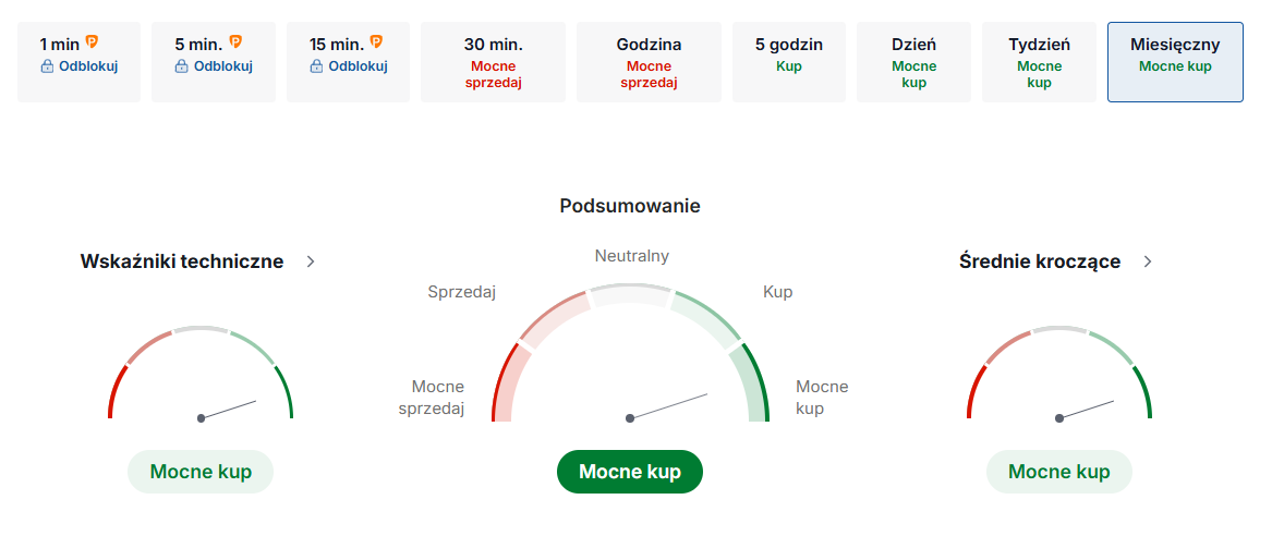 Wskaźniki techniczne jednoznacznie wskazują na kontynuację ruchu w górę. Wszystkie główne oscylatory prezentują sygnał Kup, w tym RSI(14) pozostający na poziomie 57,4, MACD(12,26) z dodatnią wartością 2,72, a także Williams %R, CCI, ADX oraz Ultimate Oscillator. Ich zgodność sugeruje stabilny i umocniony impet wzrostowy bez oznak wyczerpania trendu. Jedynym elementem ostrzegawczym jest STC RSI w strefie wykupienia, co jednak nie zmienia ogólnej przewagi kupujących.