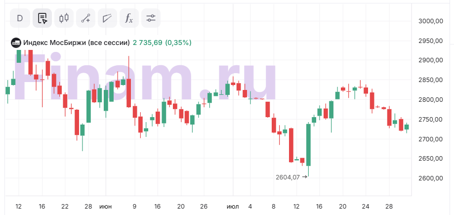Сегодня российский рынок показал уверенный рост, игнорируя санкционное давление: индекс МосБиржи поднялся на 0,2% до 2732,12 пункта, РТС окреп на 2,1% до 1071,61 пункта. «Несмотря на то, что на рынок продолжает давить вероятный 10-дневный дедлайн президента США Дональда Трампа по возможному введению вторичных санкций, укрепившийся рубль заметно поднял индекс РТС», - прокомментировал Алексей Калачев, аналитик ФГ «ФИНАМ». Рост рынок продолжает и на вечерней сессии. Рублевый индекс подрастает на 0,3% до 2734 пункта.