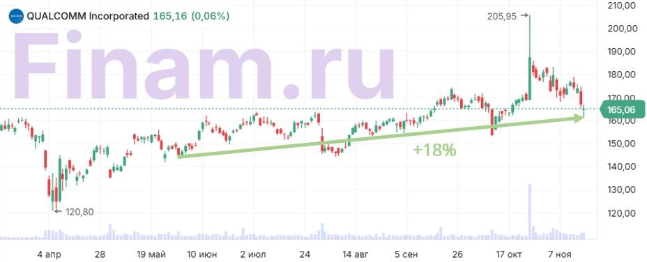 С момента открытия инвестиционной идеи на покупку акций Qualcomm от 6 июня, их стоимость выросла на 18%. Ранее мы отмечали, что драйверами роста была стратегия диверсификации бизнеса, которая снижает зависимость от сегмента смартфонов, а также заметный дисконт по мультипликаторам к бумагам конкурентов в полупроводниковом секторе. Недавний рост акций компании обусловлен сильными финансовыми результатами годового отчета, а также анонсом новых ускорительных плат и стоек компании для ЦОД. При этом фундаментальные показатели и прогноз чистой прибыли на ближайшие годы существенно не изменились, а антимонопольное расследование в Китае остаётся фактором неопределённости. В связи с этим мы считаем, что дальнейший рост ограничен и придерживаемся нейтрального взгляда на перспективы бумаг при целевой цене $178,4 (потенциал 8,1%).