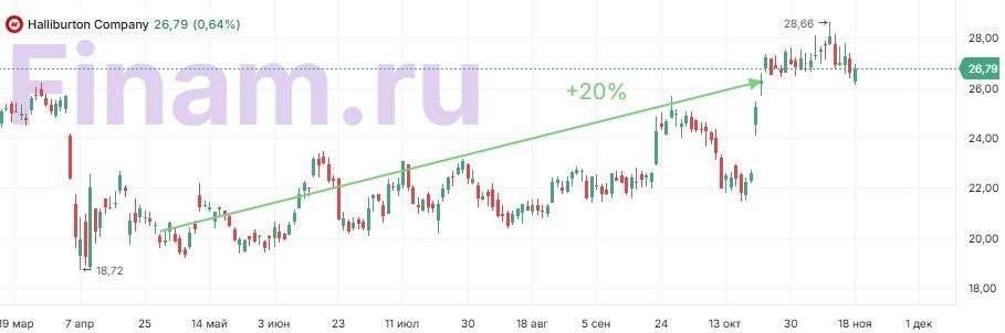 С момента публикации нашей идеи по акциям Halliburton от 30 апреля по 22 октября они выросли на 20% и почти достигли нашей целевой цены $25,4. Рост происходил в рамках отскока после довольно долгого периода снижения. Поддержку акциям нефтесервисной компании оказал неплохой отчёт за 3-й квартал и привлекательные выплаты акционерам. В то же время после недавней волны роста мы понизили рейтинг по акциям Halliburton до «Держать». Компания фокусируется на американском рынке, который наиболее чувствителен к снижению цен на нефть, что может сдерживать динамику финансовых результатов Halliburton.