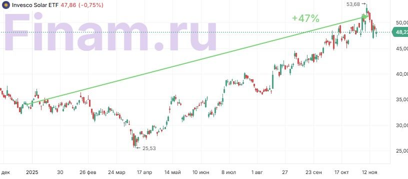 С момента публикации нашей идеи по Invesco Solar ETF от 25 декабря 2024 года по 10 ноября 2025 года он вырос более чем на 45% и превысил нашу целевую цену $48,4. В конце прошлого и начале текущего года ETF находился под давлением из-за опасений относительно влияния прихода Трампа на солнечную энергетику в США. Однако опасения оказались избыточными и в текущем году прирост мощностей в сфере солнечной энергетики в Штатах может быть рекордным. При этом далее, согласно ожиданиям ведущих мировых агентств, темпы ввода могут перейти к стагнации. Кроме того, после роста мультипликаторы в секторе уже не выглядят настолько привлекательными. На этом фоне недавно мы понизили рейтинг по Invesco Solar ETF до «Держать».