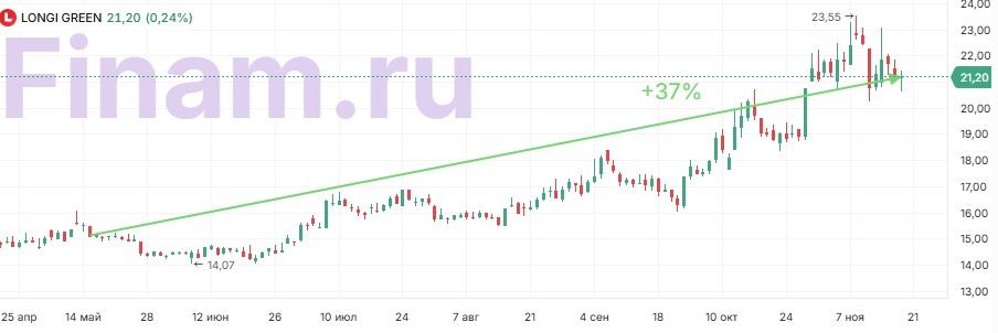 С момента публикации нашей идеи по акциям LONGI Green Energy от 14 мая они выросли на 37%. Положительная динамика была связана с публикацией сильного отчёта за 3-й квартал и общим позитивом в секторе. Базово мы ожидаем, что положительные тенденции 3-го квартала продолжатся, что может позволить LONGI Green Energy в следующем году вернуться к прибыли. При этом перспективы развития солнечной энергетики в Китае остаются безоблачными благодаря постепенному замещению угля. На этом фоне недавно мы повысили нашу целевую цену по акциям LONGI Green Energy до RMB 25,5 (потенциал около 20%) и сохранили рейтинг «Покупать».