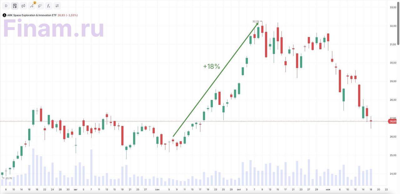 Акции биржевого инвестиционного фонда ARKX, который инвестирует преимущественно в компании, связанные с исследованием космоса и инновациями, за период с публикации нашей инвестиционной идеи от 5 сентября 2025 г., выросли на 18% и превысили нашу целевую цену. В начале октября мы скорректировали рейтинг бумаги до «Держать» с сохранением целевой цены $29,9. Рост акций космического ETF обусловлен значительным увеличением доходов компаний сектора и перспективными ожиданиями в секторе космических технологий, включая запуск спутников. Акции фонда интересны на просадке. Текущий потенциал составляет около 11%. Ключевыми рисками остаются политическая напряженность на фоне тарифных войн и капиталоемкость отрасли, а также повышенные процентные ставки.