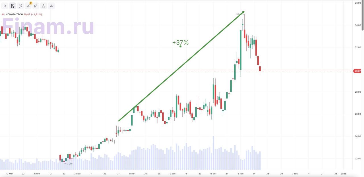 Акции китайского производителя электромеханических компонентов Hongfa, за период с публикации нашей инвестиционной идеи от 1 августа 2025 г., выросли на 37%. В начале ноября мы скорректировали рейтинг бумаги до «Держать» с сохранением целевой цены CNY 34,36. Котировки выросли благодаря росту спроса на продукцию, а также инвестициям компании в развитие международных производственных мощностей, что поддержало ожидания инвесторов относительно потенциала роста финансовых показателей. Кейс остаётся привлекательным (текущий потенциал около 15%), и возможную просадку можно рассматривать для добора позиции. Однако сохраняются риски, связанные с возможной волатильностью спроса, конкуренцией и зависимостью от ситуации на мировых рынках.
