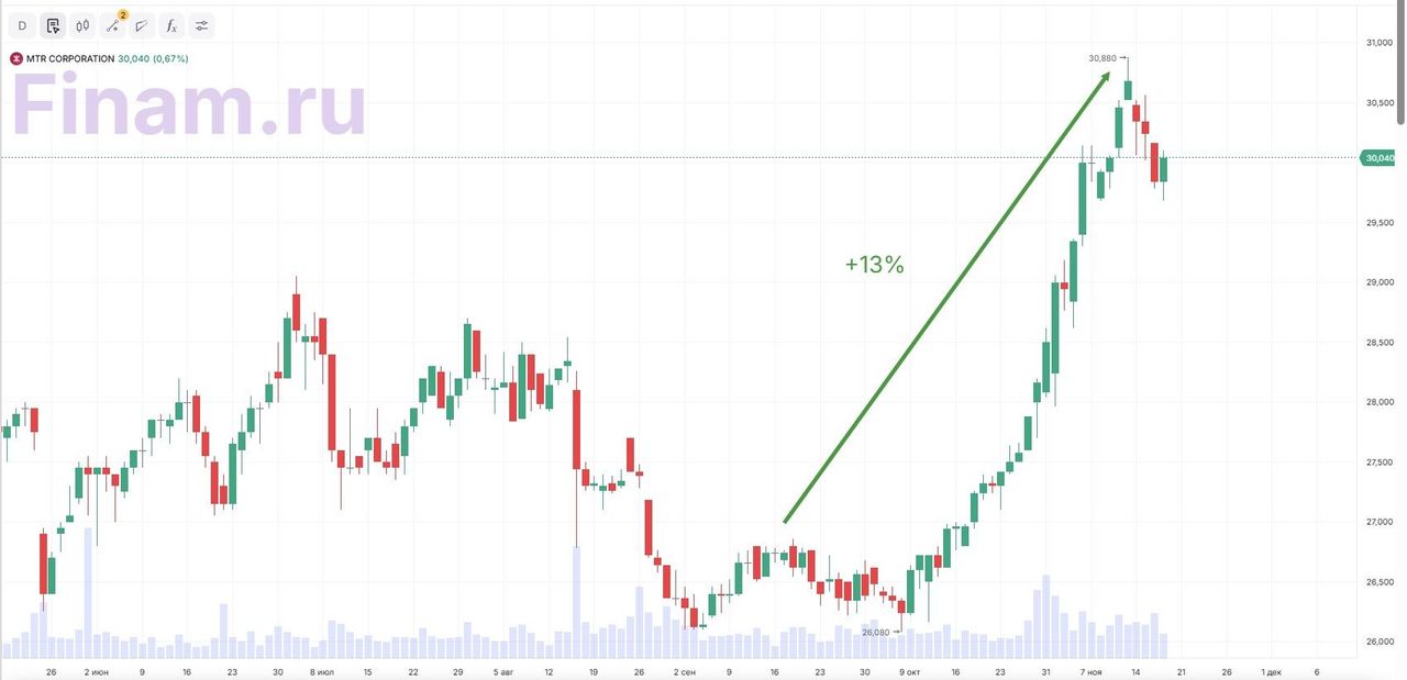 Акции гонконгской транспортно-девелоперской компании MTR, за период с публикации нашей инвестиционной идеи от 18 сентября 2025 г., выросли на 13%. В середине ноября мы скорректировали рейтинг бумаги до «Держать» с сохранением целевой цены HKD 31,5. Текущий потенциал 5,0%. Компания продолжает наращивать пассажиропоток и развивать железнодорожную сеть, а также внедрять ИИ технологии для управления недвижимостью. Основными рисками остаются снижение спроса на недвижимость из-за внешнеэкономических факторов, а также задержки и превышение бюджета при реализации инфраструктурных проектов и сложности международной деятельности.