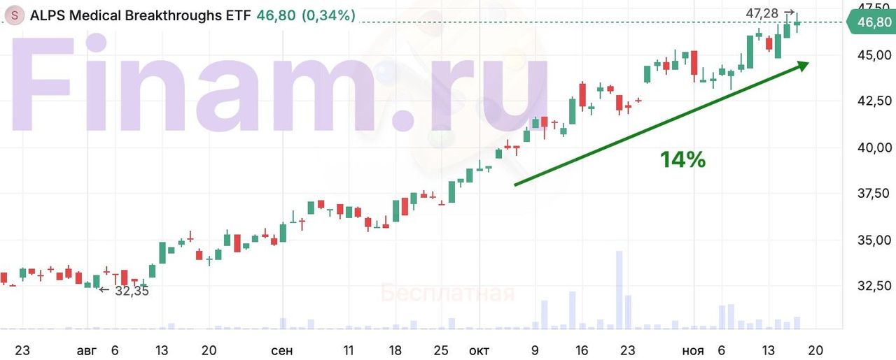 С момента публикации нашей инвестиционной идеи по ALPS Medical Breakthroughs ETF в октябре индексный фонд показал солидный рост в размере 14% менее чем за полтора месяца. Биотех за последние месяцы перешел на траекторию роста на фоне того, что слишком долго и неоправданно пребывал в опале у инвесторов, и фундаментальная недооцененность сектора стала бросаться в глаза. Прорывы и открытия в медицине происходят независимо от геополитики и решений Трампа – регуляторные изменения не особенно влияют на науку и исследования. Инструмент все еще выглядят фундаментально недооцененным — апсайд составляет порядка 17%, целевая цена $54,7, рейтинг «Покупать».