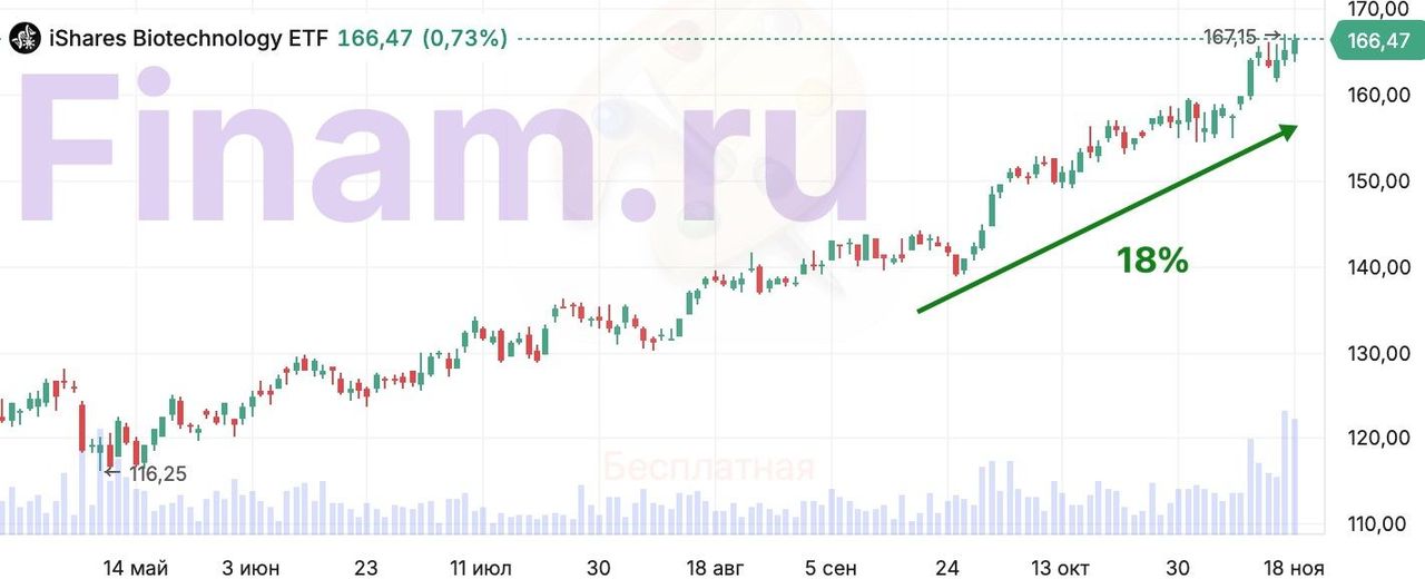 С момента публикации нашей инвестиционной идеи по iShares Nasdaq Biotechnology ETF в сентябре индексный фонд показал динамичный рост и принес доходность в размере 18% за 2 месяца. В последние месяцы биотехнологический сектор уверенно растет после затяжного периода просадки и отсутствия интереса со стороны инвесторов. Важнейшие достижения и инновационные открытия в медицине происходят вне зависимости от мировой политической конъюнктуры, биотех развивается своим чередом, продолжая открывать новые возможности. Многие компании биотеха отчитались за 3 квартал с превышением прогнозов и не ухудшили своих ожиданий на 2025 год. После периода динамичного роста целевая цена по iShares Nasdaq Biotechnology ETF в настоящее время помещена на пересмотр.