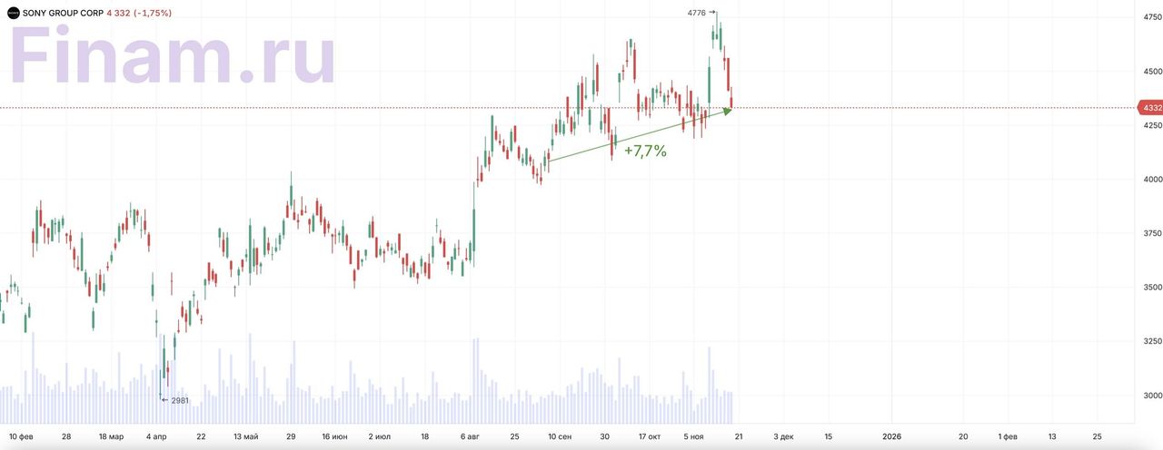 Акции японской Sony за период с публикации нашей инвестиционной идеи от 5 сентября 2025 г. выросли на 8%. Рост поддерживался укреплением операционных показателей компании и более высокими ожиданиями по спросу в ключевых бизнес-линейках (включая игровое подразделение и подразделения, связанные с датчиками изображения и развлекательным контентом), что улучшило прогнозы по выручке и прибыльности. Текущий потенциал идеи 16,1% при таргете 5 028 йен. Ключевые риски по-прежнему включают цикличность спроса на потребительскую электронику, высокую конкуренцию и влияние курса йены на экспорт и инфляции в Японии.