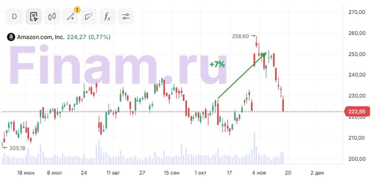 Акции Amazon с момента публикации нашей идеи на покупку от 10 октября выросли на 7%. В середине ноября цена бумаги приблизилась к нашему таргету, в связи с чем рейтинг был скорректирован до «Держать», с сохранением целевой цены на уровне $266 за бумагу. Рост котировок был обоснован сильной третье квартальной отчетностью Amazon: выручка компании выросла на 12% г/г и составила $180,2 млрд, чистая прибыль выросла на 38,5% г/г, до 21,2 млрд $. Движущей силой Amazon помимо собственного крупнейшего в мире маркетплейса является рост высокомаржинального рекламного направления и ускорение темпов роста облачного бизнеса AWS. Ключевым риском для Amazon остается коррекция технологического сектора и «взрыва» AI-«пузыря». Рост Amazon и других технологических компаний США все больше зависит от ожиданий долгосрочной монетизации масштабных инвестиций в AI, из-за чего бумаги становятся крайне чувствительными к риску переоценки рынка. Негативный новостной фон — расследование Еврокомиссии в отношении облачного бизнеса Amazon, а также опасения по поводу переоценки всего технологического сектора на фоне ожиданий квартальной отчетности NVIDIA — привели к существенной коррекции котировок. Мы считаем, что даже с учетом реализации риска в сценарии слабого отчета NVIDIA текущие уровни открывают возможности выгодного входа в качественный актив в среднесрочной и долгосрочной перспективе. Текущий потенциал около 18%.