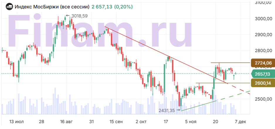 Индекс МосБиржи перешел в фазу консолидации в горизонтальном диапазоне с границами 2600 пунктов (уровень поддержки) и 2720 пунктов (уровень сопротивления). Выход индекса вверх после консолидации выглядит более вероятным. В этом случае его целью может стать значение 2850.