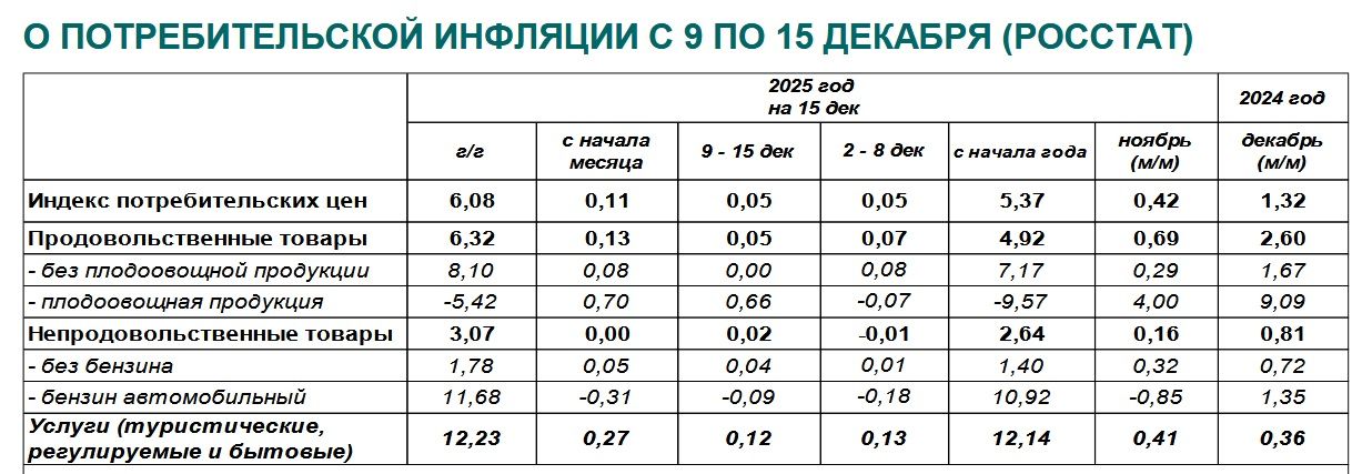 Как отмечается в обзоре Минэкономразвития на основе данных Росстата, годовая инфляция на 15 декабря замедлилась до 6,08% после 6,34% на 8 декабря.