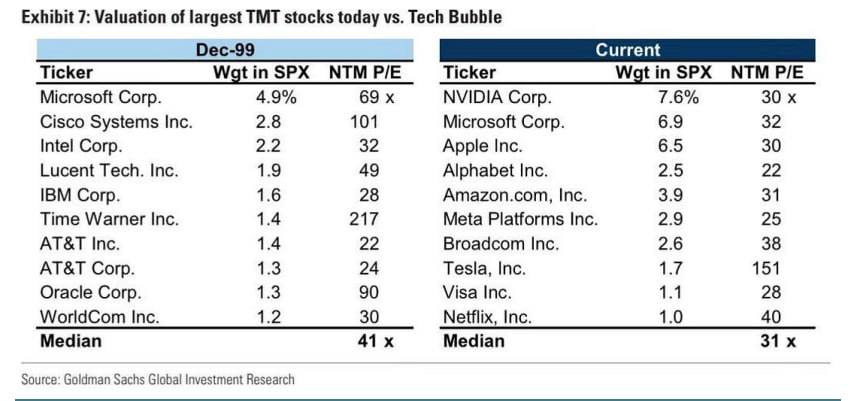 В таблице от Goldman Sachs сравнивается оценка по коэффициенту P/E 10 крупнейших компаний индекса S&P-500 сейчас и на максимуме 1999 года, перед началом «медвежьего» рынка. Кстати, обратите внимание на концентрацию- тогда топ-3 компании индекса в сумме «весили» 10%, а сейчас 20%.