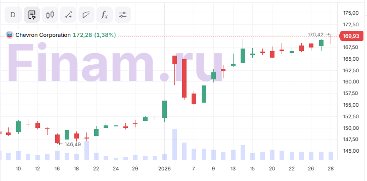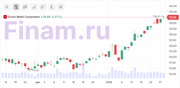 В пятницу, 30 января, крупнейшие американские нефтегазовые мейджоры Exxon Mobil и Chevron представят отчётность за четвертый квартал 2025 года. Мы ожидаем, что выручка Exxon Mobil снизится на 1,7% г/г до $ 81,7 млрд, а скорректированная чистая прибыль на акцию - на 0,6% г/г до $ 1,66. Chevron может сократить выручку на 7,7% г/г до $ 48,2 млрд и скорр. EPS на 27,2% г/г до $ 1,68.